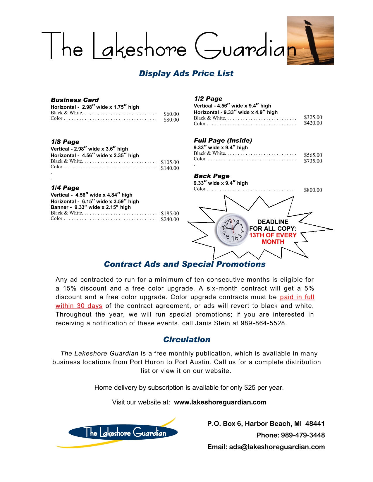 Give us a call at 989-479-3448 or send an email to: ads@lakeshoreguardian.com